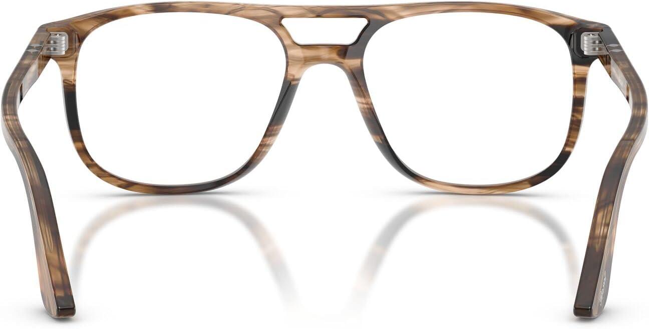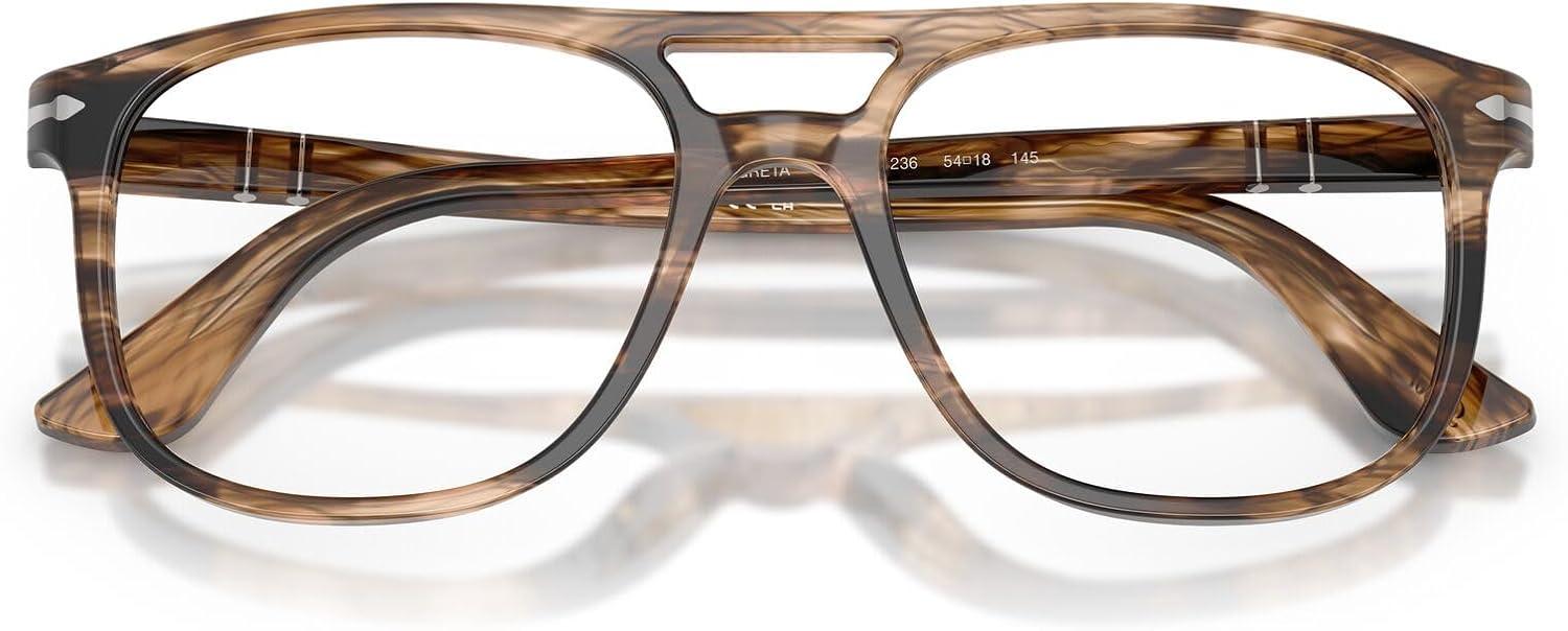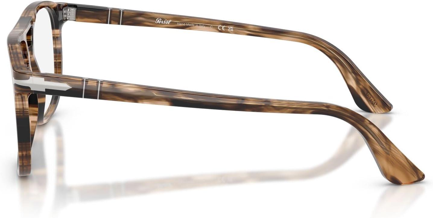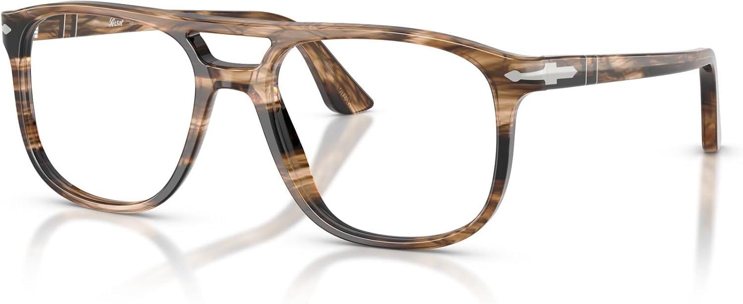 The Persol PO3329V Greta eyeglass frames feature a distinctive aviator silhouette that showcases timeless design with modern sophistication. This sophisticated design combines classic aviator proportions with bold striped acetate construction that creates confident styling with vintage-inspired appeal. Available in striking striped colorways including black and greige alongside black and olive combinations that offer both subtle and bold styling options with artistic flair. The aviator shape provides iconic proportions while the handmade-in-Italy construction ensures exceptional durability and all-day wearability. Perfect for the sophisticated individual who appreciates authentic Italian craftsmanship with classic aviator heritage and bold color expressions, these frames represent the intersection of timeless design and modern creativity with quality materials refined over decades. These frames transition effortlessly from creative environments to exclusive social settings where vintage-inspired style meets refined taste. These prescription-ready frames are designed to be fitted with your custom prescription lenses for clear vision. Each pair comes with a protective case and cleaning cloth to preserve your frames and maintain their pristine appearance. Persol eyeglass frames sold by authorized sellers, like Amazon.com, are eligible for all manufacturer warranties and guarantees.