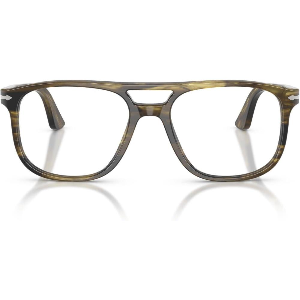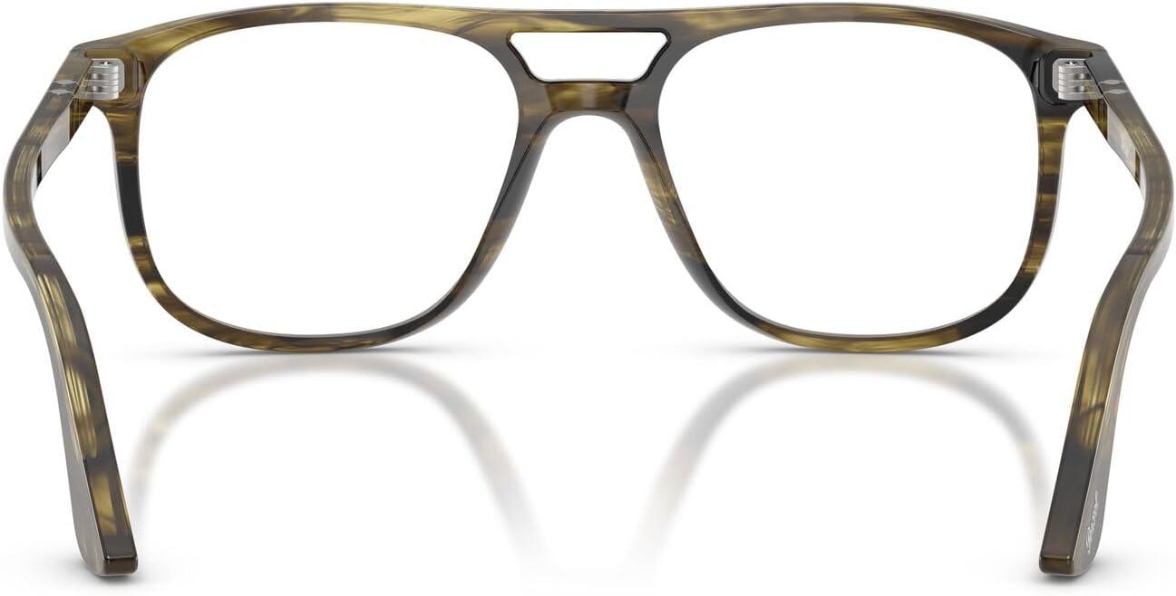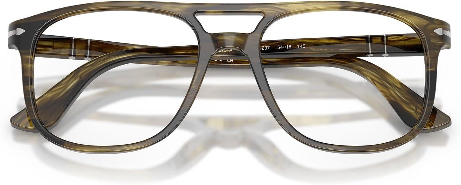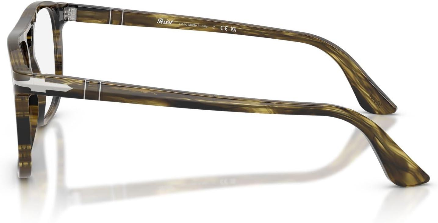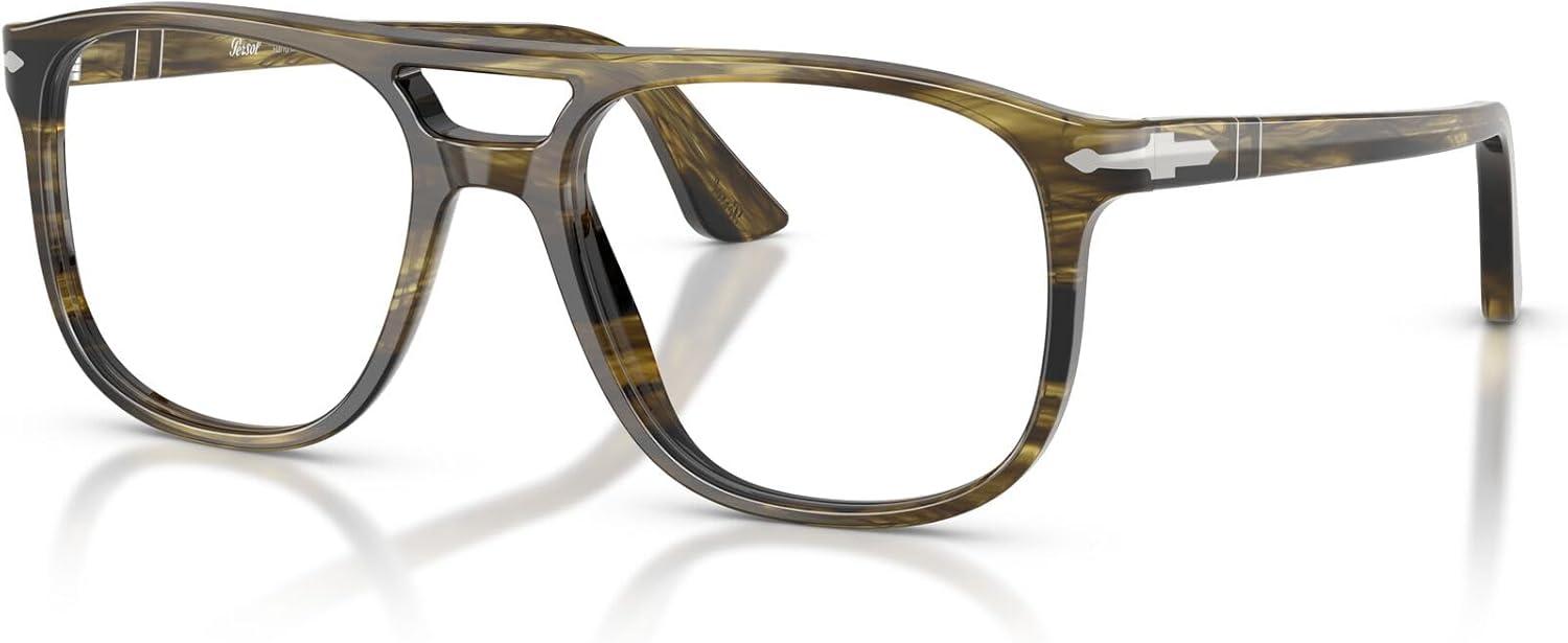 The Persol PO3329V Greta eyeglass frames feature a distinctive aviator silhouette that showcases timeless design with modern sophistication. This sophisticated design combines classic aviator proportions with bold striped acetate construction that creates confident styling with vintage-inspired appeal. Available in striking striped colorways including black and greige alongside black and olive combinations that offer both subtle and bold styling options with artistic flair. The aviator shape provides iconic proportions while the handmade-in-Italy construction ensures exceptional durability and all-day wearability. Perfect for the sophisticated individual who appreciates authentic Italian craftsmanship with classic aviator heritage and bold color expressions, these frames represent the intersection of timeless design and modern creativity with quality materials refined over decades. These frames transition effortlessly from creative environments to exclusive social settings where vintage-inspired style meets refined taste. These prescription-ready frames are designed to be fitted with your custom prescription lenses for clear vision. Each pair comes with a protective case and cleaning cloth to preserve your frames and maintain their pristine appearance. Persol eyeglass frames sold by authorized sellers, like Amazon.com, are eligible for all manufacturer warranties and guarantees.