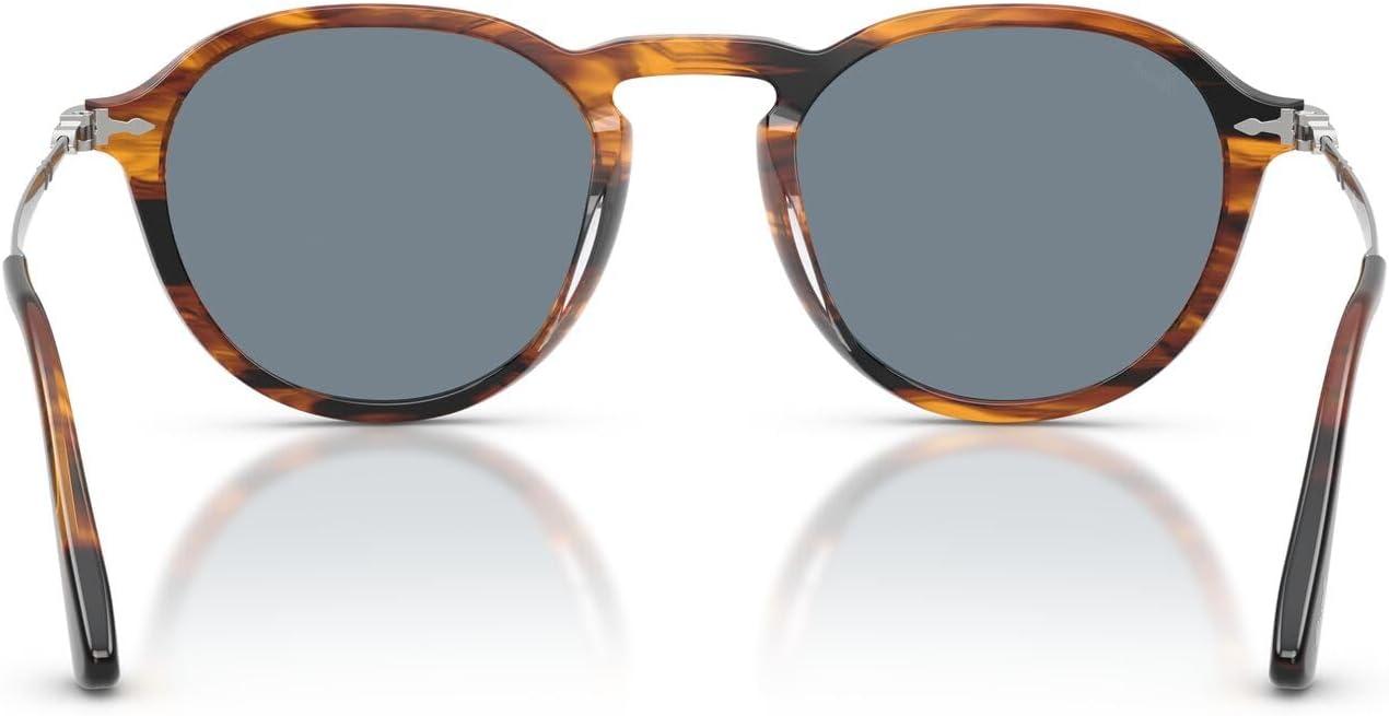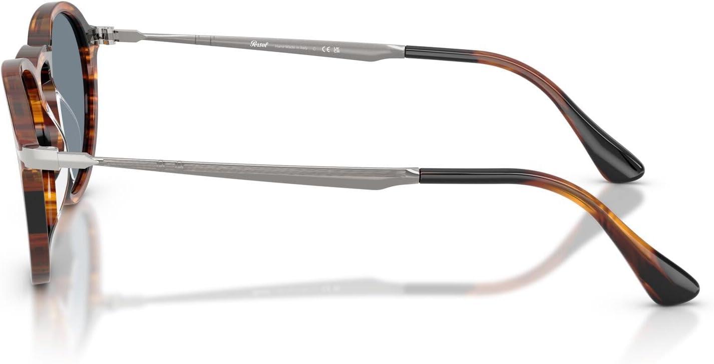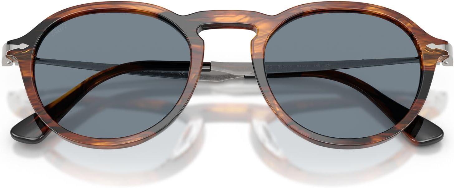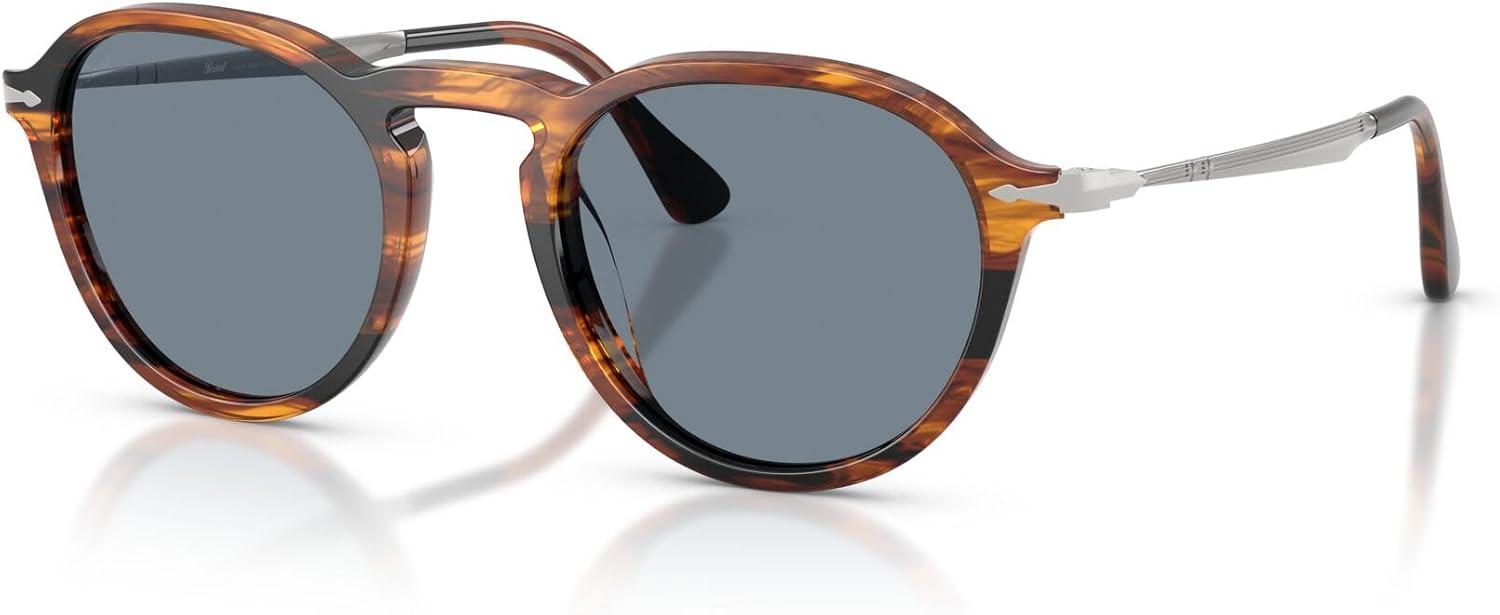 The Persol PO3383S sunglasses feature a distinctive round silhouette from Persol's Galleria collection. This sophisticated design showcases distinctive acetate seamlessly paired with sleek, thin metal temples and acetate temple tips that create impeccable craftsmanship with a perfect balance between elegance and modernity. Available in versatile frame and lens combinations including striped black and brown with light blue lenses, striped black and greige with brown lenses, striped black and olive with green lenses, striped black and grey with blue lenses, havana with polarized green lenses, and black with polarized dark grey lenses that offer both classic and contemporary styling options. The round shape provides flattering proportions while the handmade-in-Italy construction ensures exceptional durability and all-day wearability. Perfect for the sophisticated individual who embodies charisma and personal style, these sunglasses represent the intersection of art and design with quality materials refined over decades. For those who value authentic Italian design legacy, these frames transition effortlessly from international travel to exclusive social settings. All lenses offer complete UV protection to shield your eyes from harmful rays during outdoor activities and daily wear. Each pair comes with a protective case and cleaning cloth to preserve your frames and maintain their pristine appearance. Persol sunglasses sold by authorized sellers, like Amazon.com, are eligible for all manufacturer warranties and guarantees.