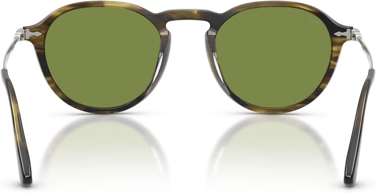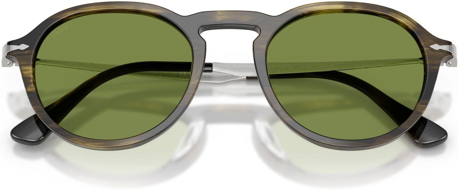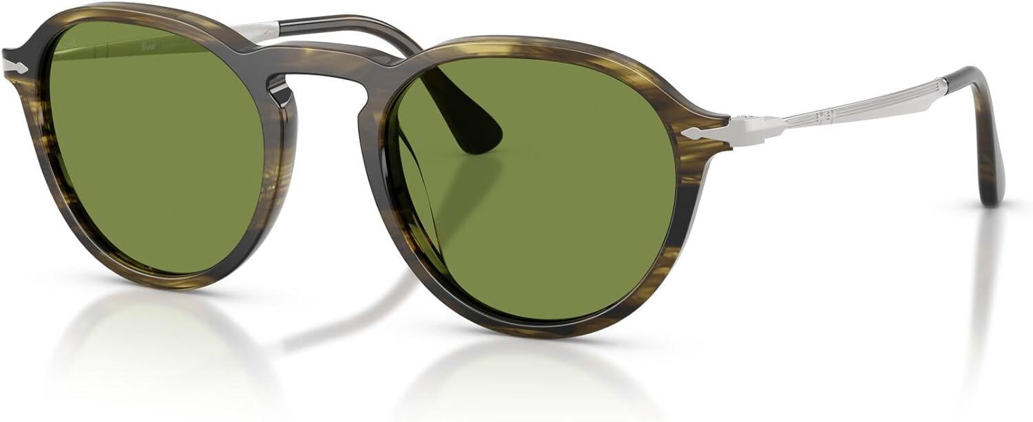 The Persol PO3383S sunglasses feature a distinctive round silhouette from Persol's Galleria collection. This sophisticated design showcases distinctive acetate seamlessly paired with sleek, thin metal temples and acetate temple tips that create impeccable craftsmanship with a perfect balance between elegance and modernity. Available in versatile frame and lens combinations including striped black and brown with light blue lenses, striped black and greige with brown lenses, striped black and olive with green lenses, striped black and grey with blue lenses, havana with polarized green lenses, and black with polarized dark grey lenses that offer both classic and contemporary styling options. The round shape provides flattering proportions while the handmade-in-Italy construction ensures exceptional durability and all-day wearability. Perfect for the sophisticated individual who embodies charisma and personal style, these sunglasses represent the intersection of art and design with quality materials refined over decades. For those who value authentic Italian design legacy, these frames transition effortlessly from international travel to exclusive social settings. All lenses offer complete UV protection to shield your eyes from harmful rays during outdoor activities and daily wear. Each pair comes with a protective case and cleaning cloth to preserve your frames and maintain their pristine appearance. Persol sunglasses sold by authorized sellers, like Amazon.com, are eligible for all manufacturer warranties and guarantees.