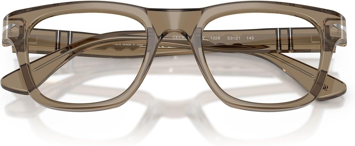 The Persol PO3389V Cecil eyeglass frames feature a squared and bold silhouette from Persol's Officina collection. This sophisticated design showcases a vintage allure with bio-acetate material reintroduced with a new color palette, featuring medium, versatile and timeless transparent tones that creates contemporary luxury appeal with confident styling. Available in a curated range including classic havana and black alongside medium, versatile and timeless transparent tones in ocean, brown heart, and brown grey that offer both traditional and modern styling options. The square shape provides statement proportions while the handmade-in-Italy construction ensures exceptional durability and all-day wearability. Perfect for the sophisticated individual who appreciates authentic Italian craftsmanship with environmental consciousness, these frames represent the intersection of art and design with sustainable materials refined over decades. These frames transition effortlessly from professional boardrooms to creative environments and exclusive social settings. These prescription-ready frames are designed to be fitted with your custom prescription lenses for clear vision. Each pair comes with a protective case and cleaning cloth to preserve your frames and maintain their pristine appearance. Persol eyeglass frames sold by authorized sellers, like Amazon.com, are eligible for all manufacturer warranties and guarantees.